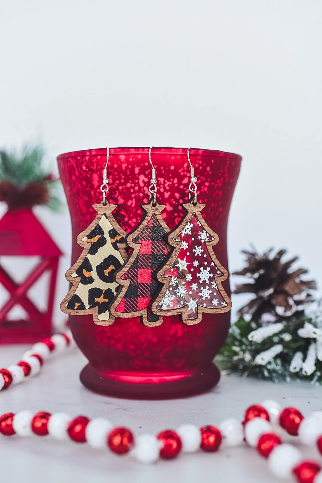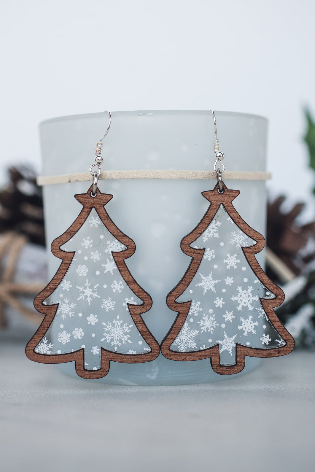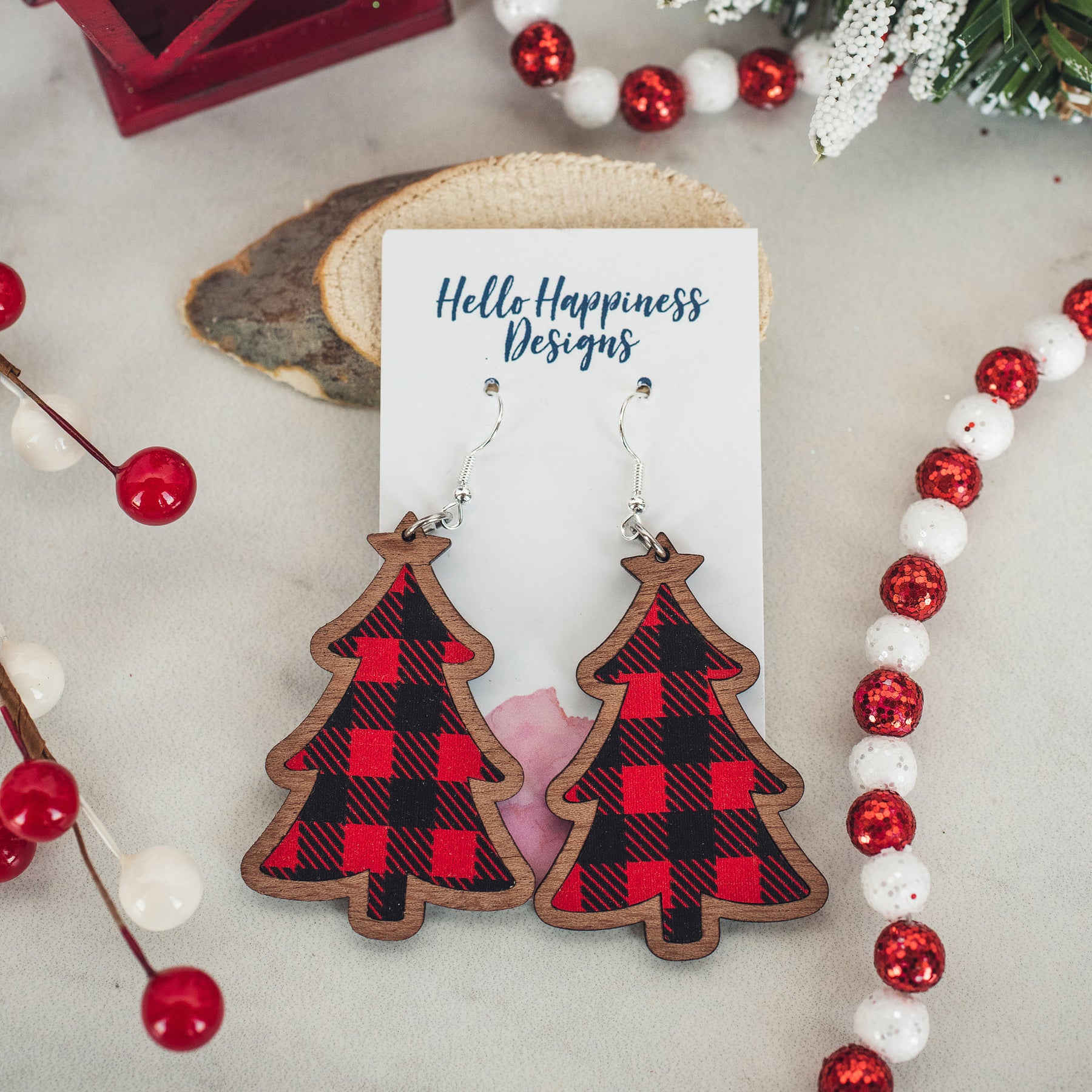 Buffalo Plaid, Snowflake Trees - wood inset dangle earrings. 2.2 inch length. Great for sensitive ears!