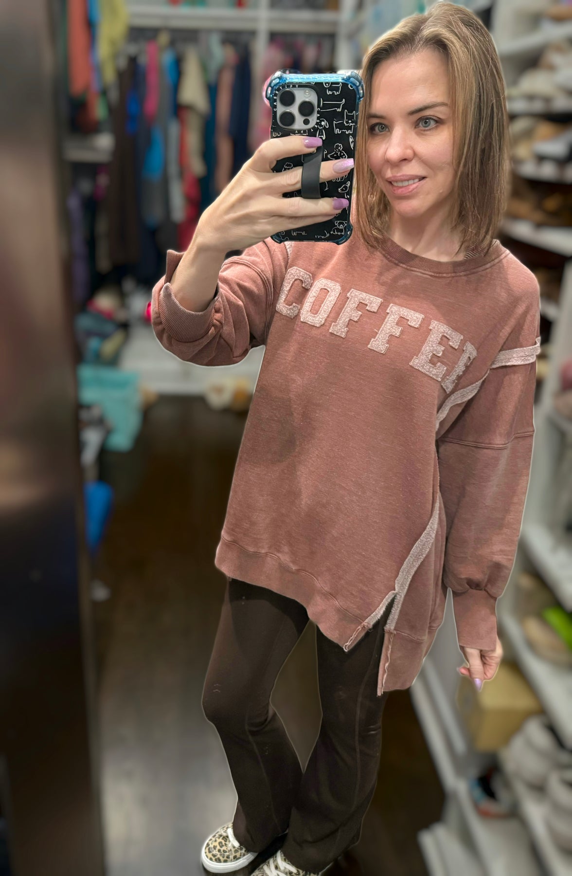 This cozy pullover is a slouchy, relaxed fit with exposed seaming, cute split cuff hem and ribbed trim detail!  Has super soft "sweatshirt" feel on the inside and features reverse fleece "COFFEE" letter on the front.